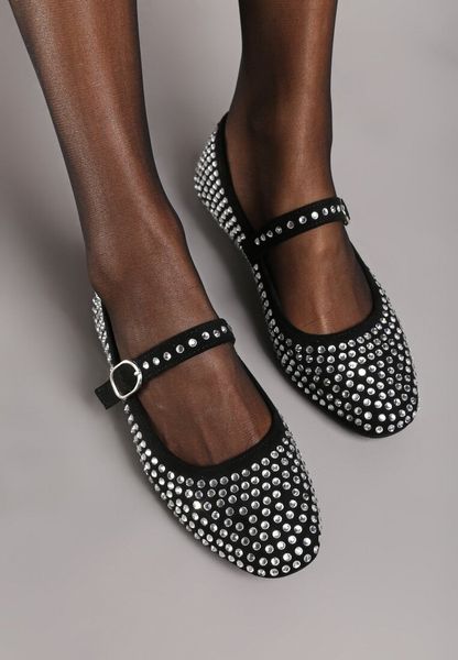 Czarne Balerinki na Płaskiej Podeszwie Mary Jane z Cyrkoniami Jomelia