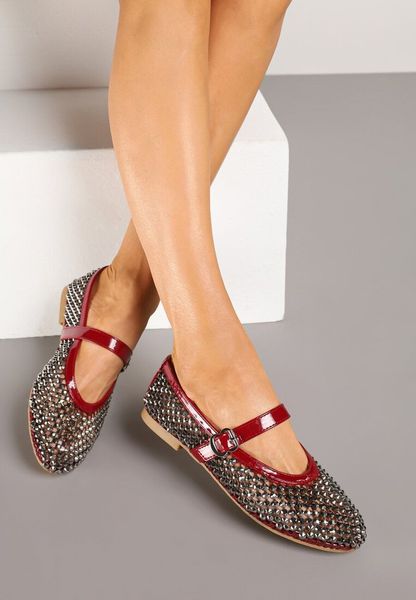 Czerwone Siateczkowe Balerinki z Paskiem z Błyszczącymi Cyrkoniami Lisabia