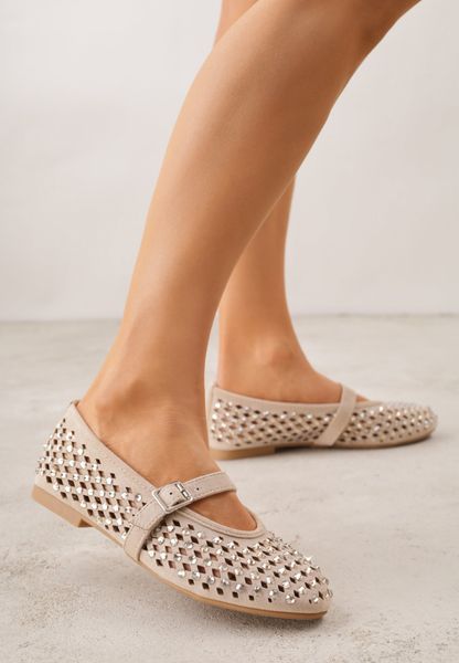 Ciemnobeżowe Ażurowe Balerinki z Paskiem z Klamerką i Cyrkoniami Feanoene