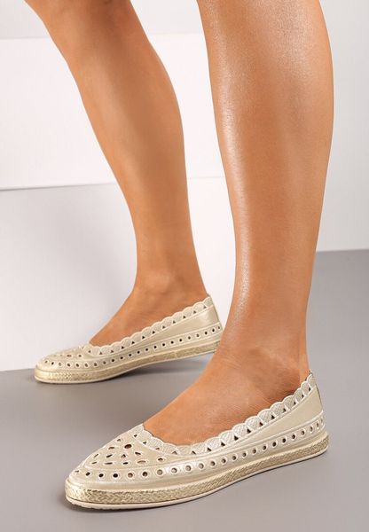 Balerinki Meledoc na płaskiej podeszwie zdobionej jutą. Wsuwane, z zakrytym noskiem o zaokrąglonej krawędzi. Ażurowe, zdobione geometrycznymi, przewiewnymi wycięciami. Wykonane z materiału tekstylnego z haftem i metaliczną nicią. Pasują np. do haftowanych sukienek albo szerokich szortów.