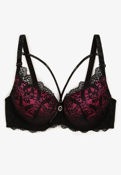 Czarno-Fuksjowy Biustonosz Full Cup z Koronką Cyrkoniami i Ozdobnym Paskiem na Regulowanych Ramiączkach Vladia