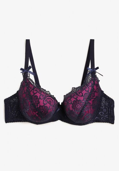 Granatowo-Fuksjowy Biustonosz Koronkowy Full Cup z Niewielką Kokardką Aelles