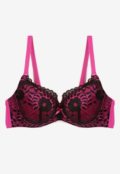 Czarno-Fuksjowy Biustonosz z Motywem Kwiatowej Koronki Nelenor
