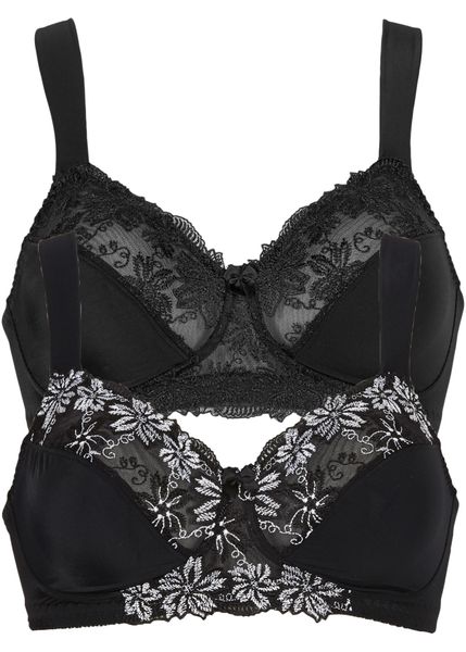 Atrakcyjny biustonosz zapewniający wysoki komfort noszenia. Bez fiszbinów. W komplecie 1x czarny z atrakcyjnym haftem w czarno-białym kolorze, 1x czarny z jednokolorowym hafem w górnej części miseczki. Wyściełane ramiączka odciążają ramiona.