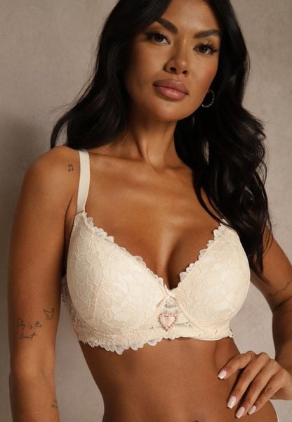 Beżowy Koronkowy Biustonosz Ozdobiony Cyrkoniowym Sercem Bothilei