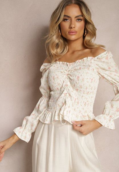Beżowo-Różowa Elastyczna Bluzka w Drobne Kwiatki Ozdobiona Falbankami Oirabel