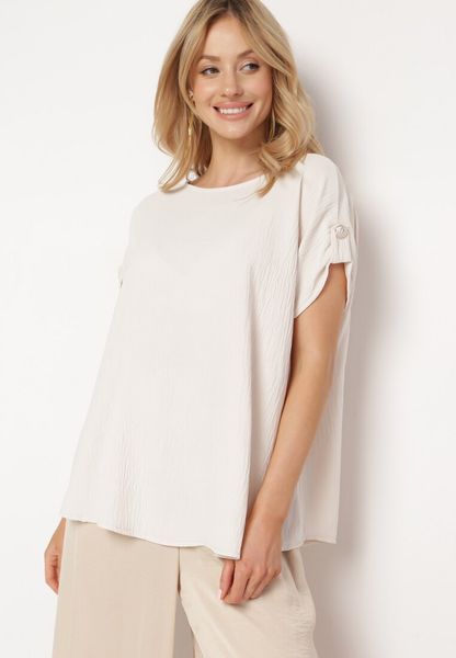 Jasnobeżowa Wiskozowa Bluzka z Krótkimi Rękawami Podpiętymi na Guzik Vesazia