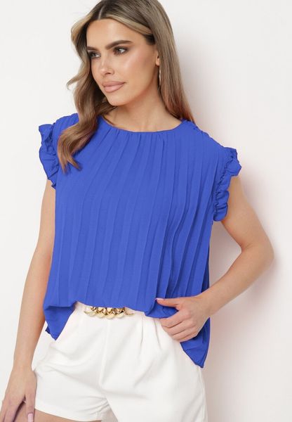 Granatowa Koszulka Top Plisowany z Krótkim Rękawem Cevaga