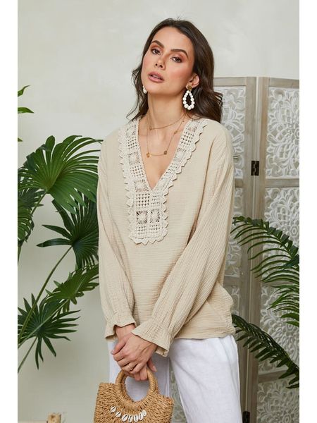 – czysta bawełna- dekolt: V- detale: szydełkowana koronka- krój: luźny- look: jednokolorowyUwaga: Na metkach odzieży tej marki znajdują się rozmiary francuskie. Rozmiarówka została przez nas przeliczona. Podane do wyboru warianty rozmiarów odpowiadają standardowym europejskim rozmiarom konfekcji. Prosimy zapoznać się z zamieszczonym objaśnieniem rozmiarów.