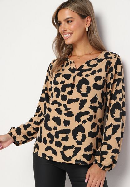 Ciemnobeżowa Bluzka z Dodatkiem Bawełny w Panterkę ze Ściągaczami przy Rękawach Armandia