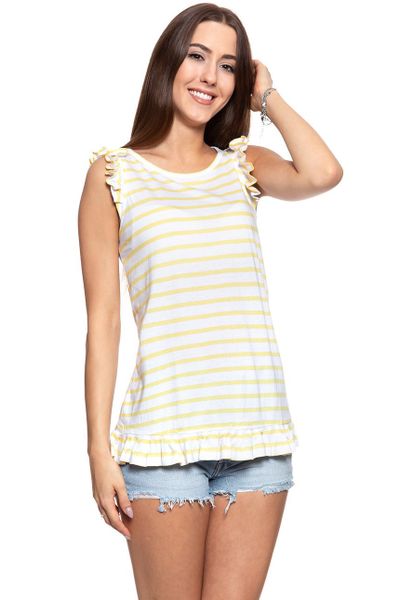 Damski bezrękawnik w kolorze białym z charakterystycznymi, żółtymi paskami. Charakteryzuje go regularny krój, okrągły dekolt.