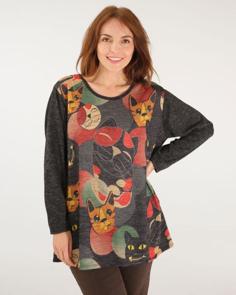Czarna bluzka wykonana z przyjemnej w dotyku dzianiny. – okrągły dekolt – długie rękawy – swobodny fason – ozdobiona cyrkoniami – kolorowy nadruk w koty z przodu Wymiary bluzki [cm]: S M L Długość całkowita: 76 78 80 Szerokość w biuście: 59 60 62 Modelka ma 175 cm wzrostu i […]