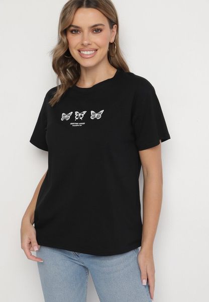 Czarna Bluzka Bawełniana Oversize z Krótkim Rękawem i Aplikacją z Motylami Lornil
