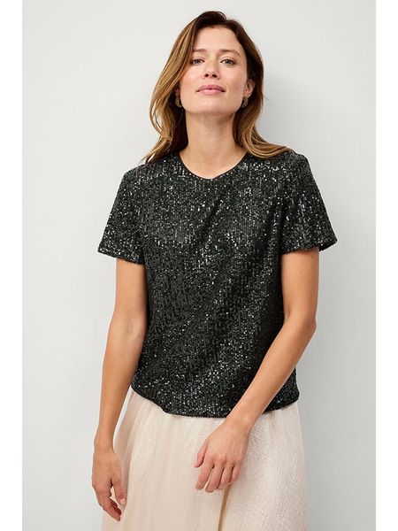 – dekolt: okrągły- powierzchnia: błyszcząca- detale: cekiny- krój: prosty- look: jednokolorowy