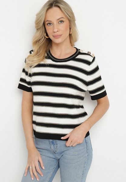 Czarno-Biała Bluzka z Wiskozy w Paski z Guzikami Cyrkoniami i Metaliczną Nicią Isasa