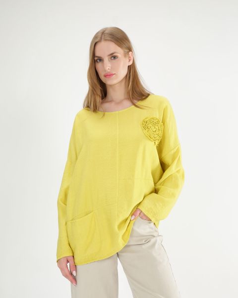 Żółta bluzka wykonana z gładkiej tkaniny o strukturze krepy. – zaokrąglony dekolt – obniżona linia przeszycia ramion – długie rękawy – z przodu kieszeń – dekoracyjny kwiat w kolorze bluzki – ozdobne przeszycia Wymiary bluzki [cm]: S M L Długość całkowita: 70 72 73 Szerokość w biuście: 66 68 70 […]