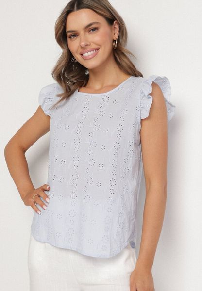 Jasnoniebieska Bawełniana Bluzka Ozdobiona Ażurowym Wzorem i Falbankami Ridiruna