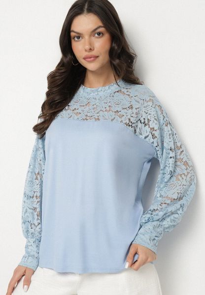 Niebieska Bluzka z Wiskozą Ozdobiona Koronką Evisso
