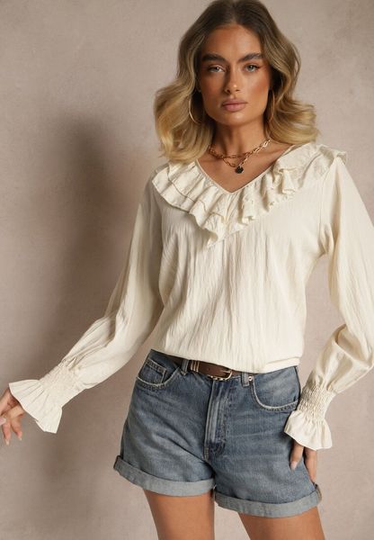 Beżowa Rustykalna Bluzka z Wiskozą z Dekoltem w Serek i Falbankami Lislimi