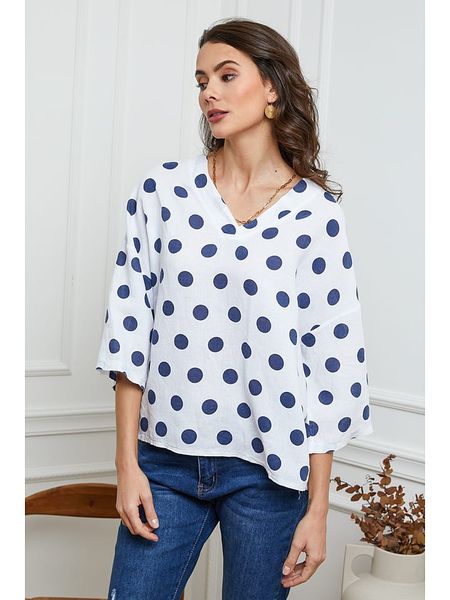 – czysty len- dekolt: V- długość rękawa: 7/8- krój: prosty- wzór: kropki