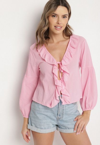 Różowa Bawełniana Bluzka z Wiązaniem Zdobiona Falbankami Idinlla