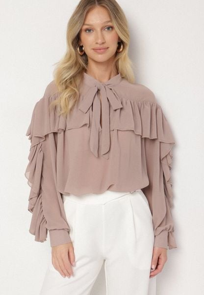 Beżowa Wiskozowa Bluzka Zdobiona Wiązaniem i Falbanami z Transparentną Wstawką Filomia