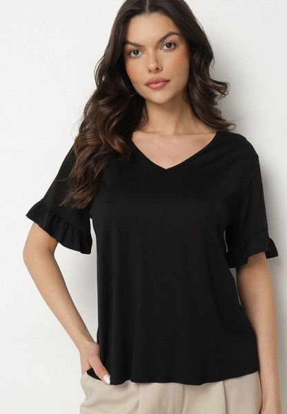 Czarna Bluzka z Dekoltem w Serek z Wiskozą Zdobiona Falbankami przy Rękawach Aliriva