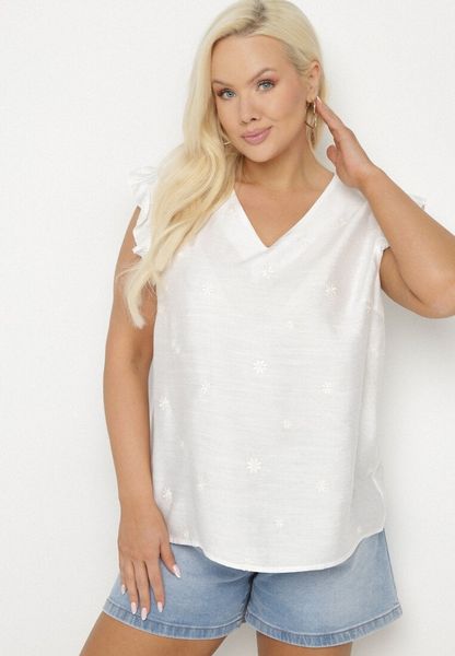 Biała Bluzka z Wiskozą Ozdobiona Haftowanymi Kwiatami Tolindra