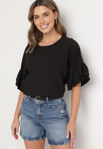 Czarna Bluzka z Wiskozą Typu Nietoperz z Falbankami Davienna