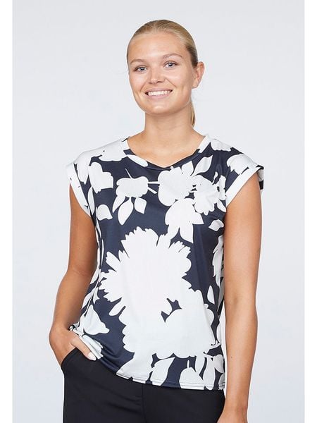 – dekolt: okrągły- zakończenie rękawa: podwijane- detale: nakładane rękawki- krój: prosty- wzór: kwiatowy