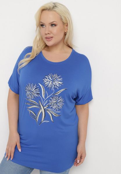 Granatowa Bluzka Ozdobiona Cyrkoniami i Metalicznym Nadrukiem Ralilena