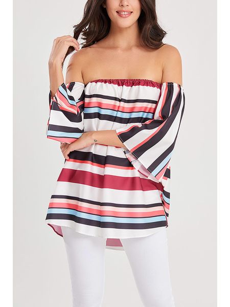 – dekolt: Carmen- długość rękawa: 3/4- krój: luźny- wzór: paskiUwaga: Przy wyborze właściwego wariantu zaleca się korzystanie z tabeli rozmiarów.
