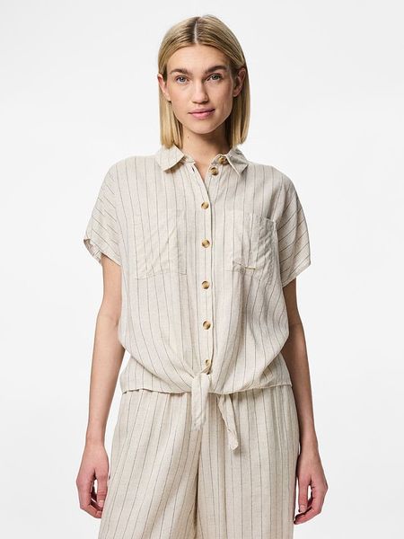 – z dodatkiem lnu- kołnierz: kent- zapięcie: listwa guzikowa- kieszenie: na piersi- dolny brzeg: z supełkami- krój: luźny- wzór: paski