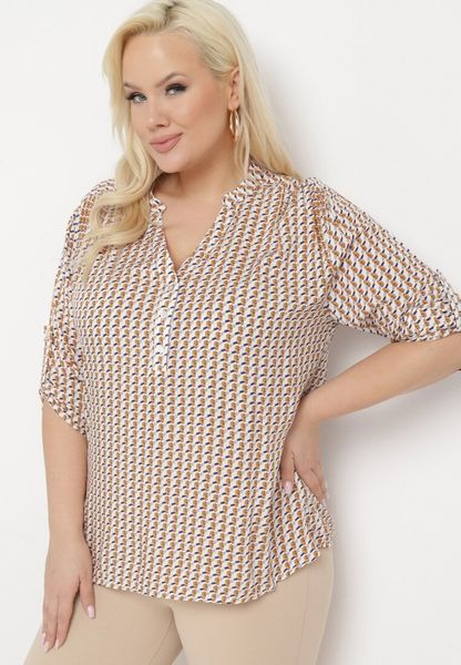 Biało-Brązowa Wiskozowa Bluzka z Guzikami przy Dekolcie i Regulowanym Rękawem Aretuzaia