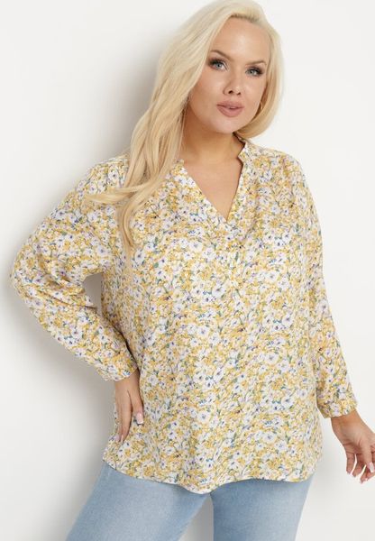 Żółta Bluzka Wiskozowa w Kwiaty o Koszulowym Fasonie Vilozi