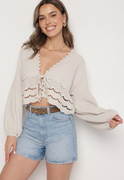 Beżowa Bawełniana Bluzka z Ażurowymi Zdobieniami i Wiązaniem Galondra