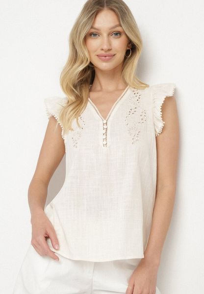 Beżowa Bawełniana Bluzka Zdobiona Haftem i Falbanką Taloretia