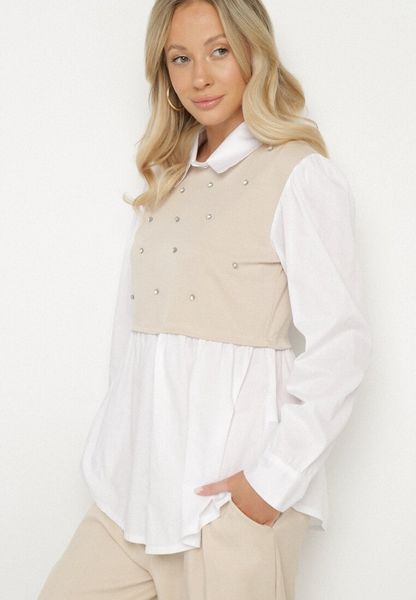 Jasnobeżowa Rozkloszowana Bluzka Koszulowa z Wiskozą z Wszytą Kamizelką z Cyrkoniami Uliaviela