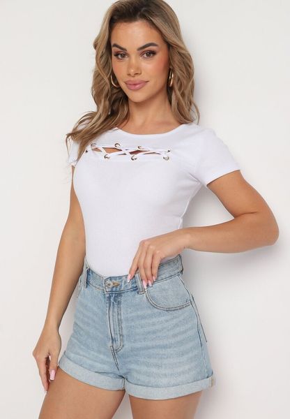 Biała Bawełniana Bluzka z Plecionym Zdobieniem przy Dekolcie Elretia