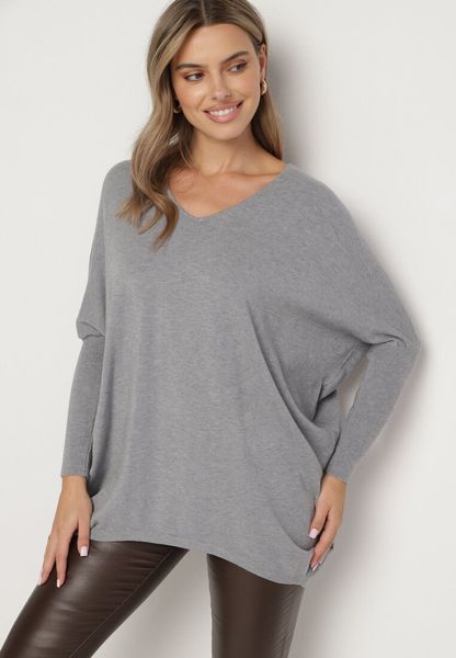 Szara Bluzka z Wiskozą o Nietoperzowym Kroju z Wycięciem na Plecach z Cyrkoniami Vaivenne