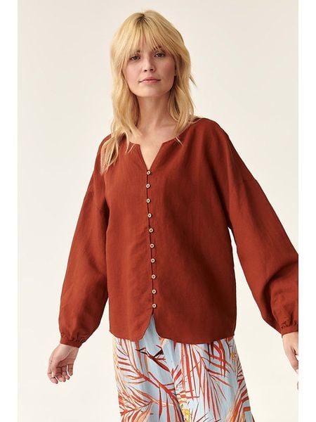 – z dodatkiem lnu- dekolt: z rozcięciem- zapięcie: listwa guzikowa- rękaw: bufiasty- zakończenie rękawów: guzik- dolny brzeg: zaokrąglony- krój: luźny- look: jednokolorowy