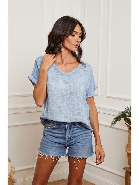 – czysty len- dekolt: V- zakończenie rękawa: podwijane- krój: prosty- wzór: melanżowy