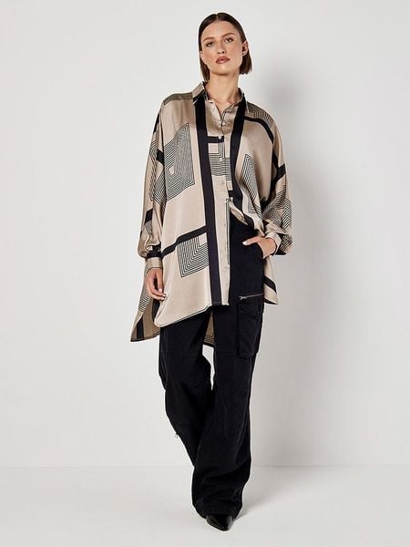 – kołnierz: kent- zapięcie: listwa guzikowa- zakończenie rękawów: guzik- dolny brzeg: z rozcięciem- krój: oversized- wzór: na całości