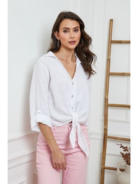 – czysty len- kołnierz: kent- dekolt: V- zapięcie: listwa guzikowa- zakończenie rękawów: patka i guzik- detale: ozdobne wiązanie- krój: prosty- look: jednokolorowy