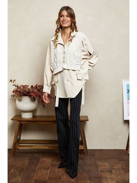 – kołnierzyk: z klapami- zapięcie: listwa guzikowa- zakończenie rękawów: mankiet na guzik- look: warstwy, jednokolorowy- krój: oversized