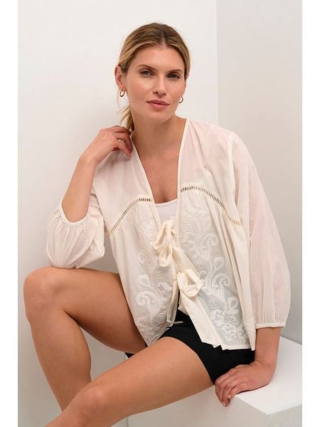 – czysta bawełna- dekolt: V- zapięcie: sznurowanie- długość rękawa: 7/8- zakończenie rękawów: elastyczne- detale: haft- krój: prosty- look: jednokolorowy