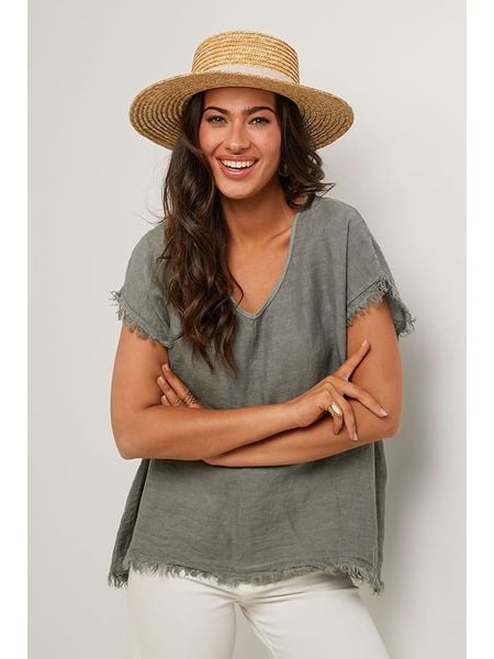 – czysty len- dekolt: łódka- detale: frędzle- krój: luźny- look: jednokolorowyUwaga: Na metkach odzieży tej marki znajdują się rozmiary francuskie. Rozmiarówka została przez nas przeliczona. Podane do wyboru warianty rozmiarów odpowiadają standardowym europejskim rozmiarom konfekcji. Prosimy zapoznać się z zamieszczonym objaśnieniem rozmiarów.