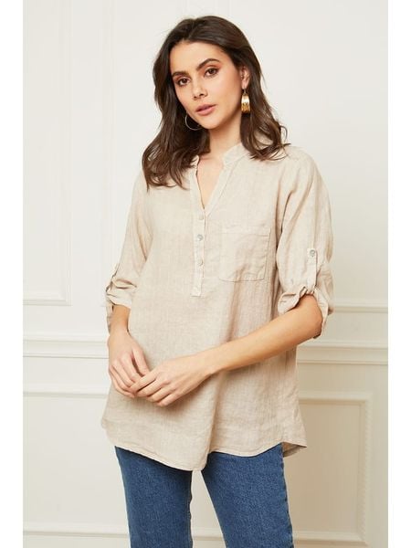 – czysty len- kołnierz: stójka- zapięcie: skrócona listwa guzikowa- zakończenie rękawów: patka i guzik- kieszenie: na piersi- krój: dłuższe plecy- look: jednokolorowy