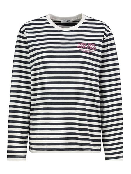 – czysta bawełna- dekolt: okrągły- krój: luźny- nadruk: w formie napisu- wzór: paski