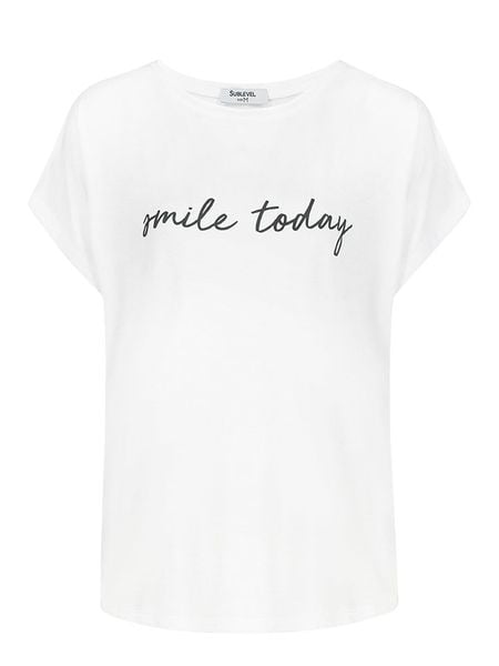 – dekolt: okrągły- detale: nakładane rękawki- krój: luźny- nadruk: w formie napisu- look: jednokolorowy